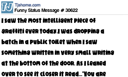 X I saw the most intelligent piece of graffiti ever today.I was dropping a batch in a public toilet when I saw something written in very small writing at the bottom of the door. As I leaned over to see it closer it read..."You are now s***ting at a 45°