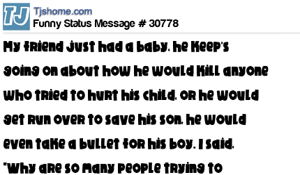 - # 98875 My friend just had a baby. He keeps going on about how he would kill anyone who tried to hurt his child, or he would get run over to save his son. He would even take a bullet for his boy. I said, “Why are so many people trying to assassinate your baby?â