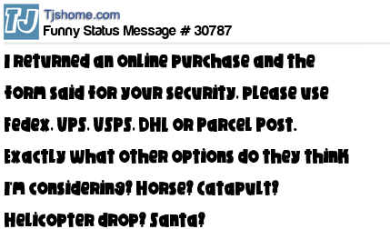 X I returned an online purchase and the form said for your security, please use Fedex, UPS, USPS, DHL or Parcel Post. Exactly what other options do they think I'm considering? Horse? Catapult? Helicopter drop? Santa?