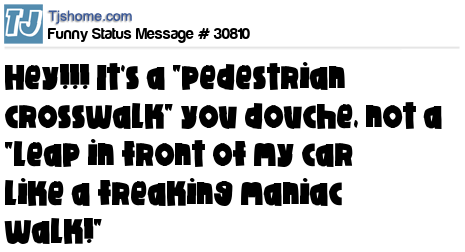 X Hey!!! It's a "pedestrian crosswalk" you douche, not a "leap in front of my car like a freaking maniac walk!"