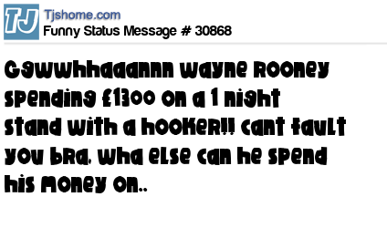 X says ggwwhhaaannn wayne rooney spending £1300 on a 1 night stand with a hooker!! cant fault you bra, wha else can he spend his money on..