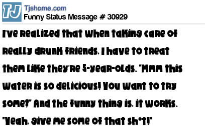 X I've realized that when taking care of really drunk friends, I have to treat them like they're 5-year-olds. "Mmm this water is so delicious! You want to try some?" And the funny thing is, it works. "Yeah, give me some of that sh*t!"