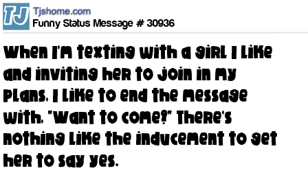X When I'm texting with a girl I like and inviting her to join in my plans, I like to end the message with, "Want to come?" There's nothing like the inducement to get her to say yes.