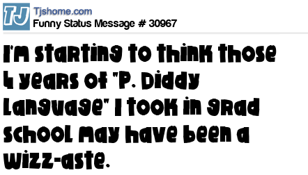 X I'm starting to think those 4 years of "P. Diddy Language" I took in grad school may have been a wizz-aste.