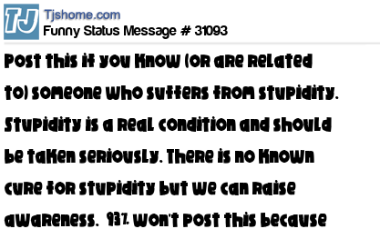 - # 12674 Please put this on your status if you know someone who is an idiot. Idiots affect the lives of many. There is still no known cure for stupidity, but we can raise awareness. 93% wont copy and paste this, mainly because they're too stupid to copy and paste