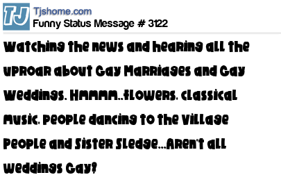 - # 3202 watching the news and doesn't understand the fuss about gay marriages and weddings...flowers, classical music, people dancing to the village people and sister sledge...aren't all weddings Gay?