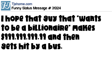 X  I hope that guy that "wants to be a billionaire" makes $999,999,999.99 and then gets hit by a bus.