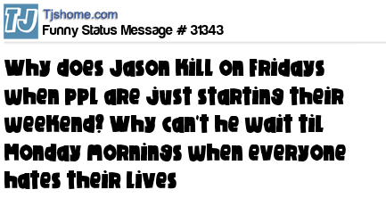 X is Why does Jason kill on Fridays when ppl are just starting their weekend? Why can't he wait til Monday mornings when everyone hates their lives