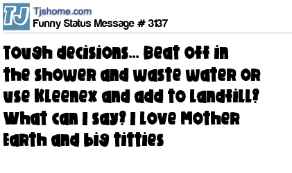 - # 3223 Tough decisions... Beat off in the shower and waste water or use Kleenex and add to landfill? What can I say? I love Mother Earth and big titties.