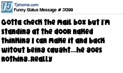 X has gotta check the mail box but I'm standing at the door naked thinking I can make it and back witout being caught....he goes nothing..really