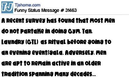 X says a recent survey has found that most men do not partake in doing Gym, Tan, Laundry (GTL) as ritual before going to an evening event/gala. Adversely, men are apt to remain active in an older tradition spanning many decades... Shave, Shower, Sh-it. (SSS)