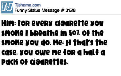 X Him: For every cigarette you smoke I breathe in 50% of the smoke you do. Me: If that's the case, you owe me for a half a pack of cigarettes.