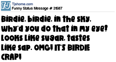 - # 31592 Birdie Birdie in the sky did a poopie in my eye. I dont swear I dont cry I'm just glad that cows dont fly