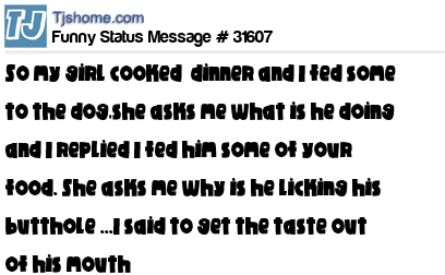 X is So my girl cooked dinner and I fed some to the dog,she asks me what is he doing and I replied I fed him some of your food. She asks me why is he licking his butthole ...I said to get the taste out of his mouth