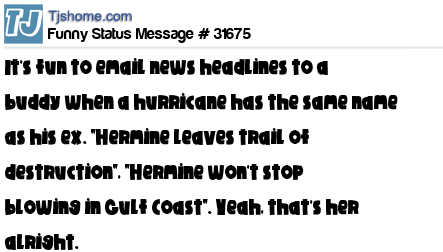X It's fun to email news headlines to a buddy when a hurricane has the same name as his ex. "Hermine leaves trail of destruction", "Hermine won't stop blowing in Gulf Coast". Yeah, that's her alright.