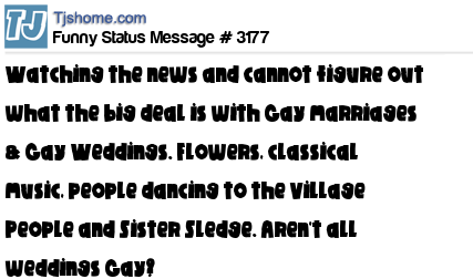 - # 3202 watching the news and doesn't understand the fuss about gay marriages and weddings...flowers, classical music, people dancing to the village people and sister sledge...aren't all weddings Gay?
