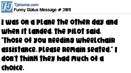 X I was on a plane the other day and when it landed, the pilot said, "Those of you needing wheelchair assistance, please remain seated." I don't think they had much of a choice.