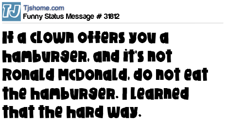 X says If a clown offers you a hamburger, and it's not Ronald McDonald, do not eat the hamburger. I learned that the hard way.