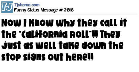 X is Now I know why they call it the "California roll"!! They just as well take down the stop signs out here!!
