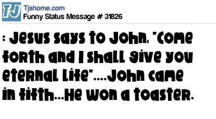 - # 138848 Jesus says to John come forth I'll give you eternal life. John came fifth he won a toaster