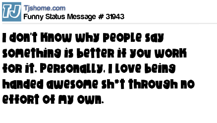 - # 31935 I don't know why people say something is better if you work for it. Personally, I love being handed awesome sh*t through no effort of my own.