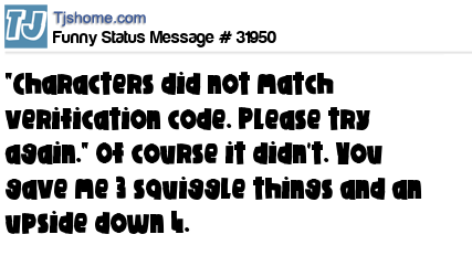 - # 31951 "Characters did not match verification code. Please try again." Of course it didn't. You gave me 3 squiggle things, a backwards P and an upside down 4.