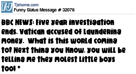 - # 32072 the Vatican is accused of laundering money?!? Next thing you know, you will be telling me they molest little boys too!