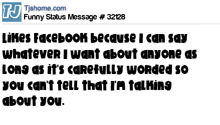 - # 23666 I like Facebook because I can say whatever I want about anyone as long as it's carefully worded so you can't tell that I'm talking about you, Sarah.