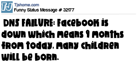 - # 32199 Facebook was down for a couple of hours today. Yep. Nine months from now, there's going to be a lot of babies born.