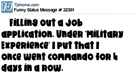 - # 169123 Memo to self: Next time you fill out a job application and it asks about military service, it is best not to mention that you've Gone Commando in your life.