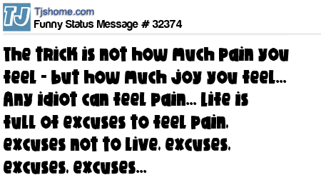 X says The trick is not how much pain you feel - but how much joy you feel... Any idiot can feel pain... Life is full of excuses to feel pain, excuses not to live, excuses, excuses, excuses...