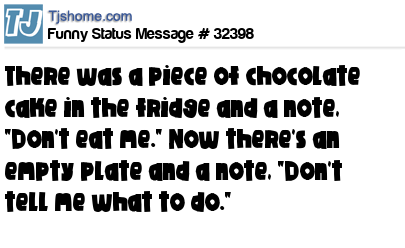 - # 37155 There was a piece of chocolate cake in the fridge and a note, "Don't eat me." Now there's an empty plate and a note, Don't tell me what to do.