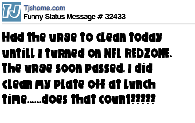 X had the urge to clean today untill I turned on NFL REDZONE. The urge soon passed, I did clean my plate off at lunch time......does that count?????