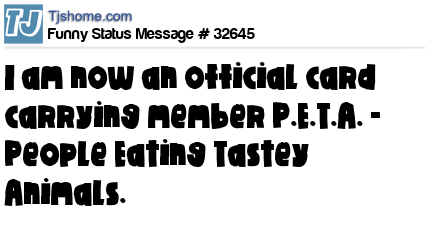 X says I am now an official card carrying member P.E.T.A. - People Eating Tastey Animals.