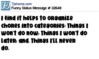 - # 32740 finds it helpful to organize chores into categories: Things I won't Do Now, Things I Won't Do Later, and Things I'll Never Do.