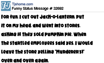X For fun, I cut out jack-o-lantern, put it on my head, and went into stores, asking if they sold pumpkin pie. When the startled employees said yes, I would leave the store yelling "Murderer's!" over and over again.