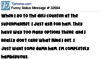X When I go to the deli counter at the supermarket, I just ask for ham. They have way too many options there, and I really don't care what kind I get. I just want some damn ham. I'm completely hambiguous.
