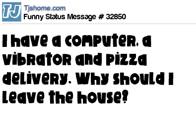- # 4856 I have a computer, a vibrator, & pizza delivery. Why should I leave the house?