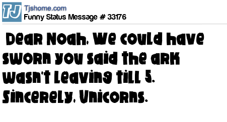 - # 73911 Dear Noah, We could have sworn you said the ark wasn't leaving till 5. Sincerely, Unicorns