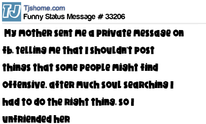 - # 24373 My mother sent me a private message on fb, telling me that I shouldn't post things that some people might find offensive. after much soul searching I had to do the right thing, so I unfriended her !