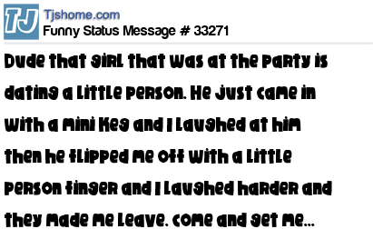 X Dude that girl that was at the party is dating a little person. He just came in with a mini keg and I laughed at him then he flipped me off with a little person finger and I laughed harder and they made me leave. come and get me...