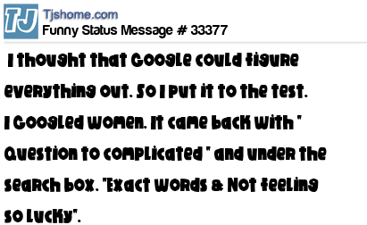 X I thought that Google could figure everything out. So I put it to the test. I Googled women. It came back with " Question to complicated " and under the search box. "Exact words & Not feeling so lucky".