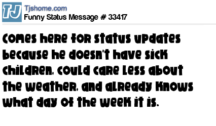 X comes here for status updates because he doesn't have sick children, could care less about the weather, and already knows what day of the week it is.