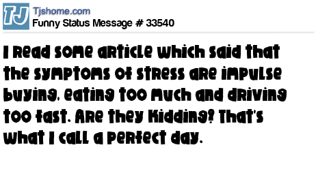 - # 7735 I read a report that said the typical symptoms of stress were eating too much, drinking too much, impulse buying, and driving too fast. Who are they kidding? That's my idea of a perfect day.