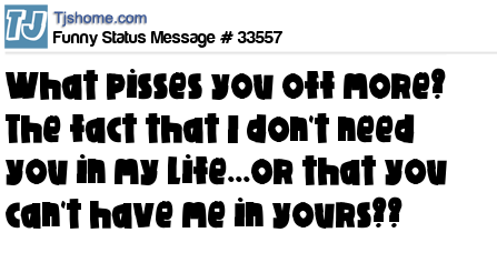 X What pisses you off more? The fact that I don't need you in my life...or that you can't have me in yours??