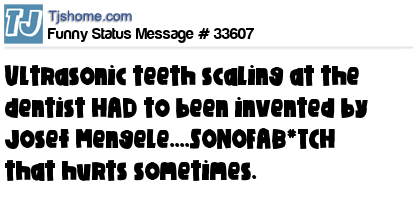 X says Ultrasonic teeth scaling at the dentist HAD to been invented by Josef Mengele....SONOFAB*TCH that hurts sometimes.