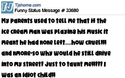 X says My parents used to tell me that if the ice cream man was playing his music it meant he had none left.....how cruel!!! and nmore-so why would he still drive into my street? just to taunt me!!??? I was an idiot child!!