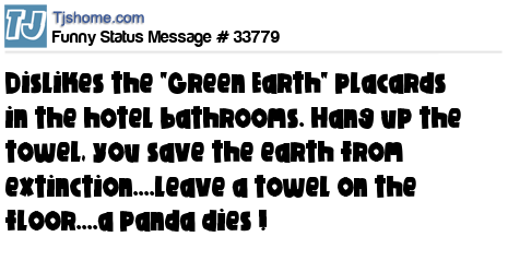 - # 33777 Really hates the "Green Earth" Placards in the hotel bathroom. Hang up your towel, save the planet from extinction.....Leave the Towel on the floor, a Panda dies!