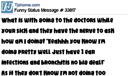 X What is with going to the doctors while your sick and they have the nerve to ask how am I doing? "Yeahhh you know I'm doing pretty well just have 2 ear infections and bronchitis no big deal!" As if they don't know I'm not doing too great.