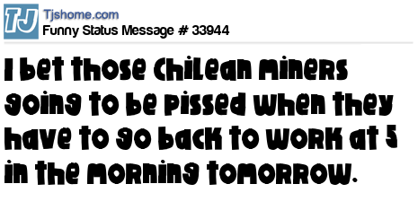 X  I bet those Chilean miners going to be pissed when they have to go back to work at 5 in the morning tomorrow.